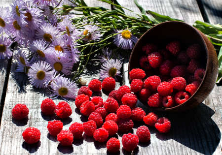 Still life. Ripe, red raspberry berries are scattered on a wooden table, a brown cup, a bouquet of lilac flowers. Close-up.