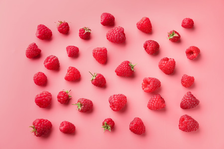 Fresh red raspberries pattern on pastel pink background. Healthy food and lifestyle.