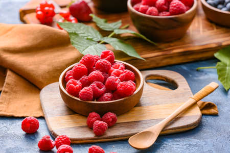 Fresh raspberries in wooden bowl on gray table. Red ripe raspberries, sweet summer berries