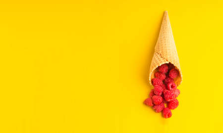 Raspberry explosion in a waffle cone on a yellow table. View from above. Healthy food concept. Minimalism. Copy space
