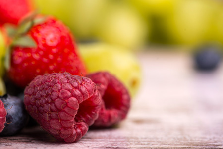 Selective focus on the tempting raspberry lying near the grape strawberry and blackberry on background