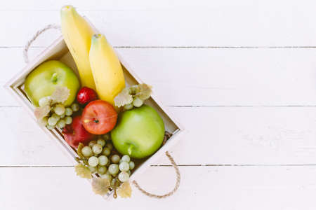 A mix of fresh fruits and berries in a wooden box and on a bright green and purple background. The tropics. Healthy food for a diet. Vitamins. Top view with a copy space. Horizontal orientation.