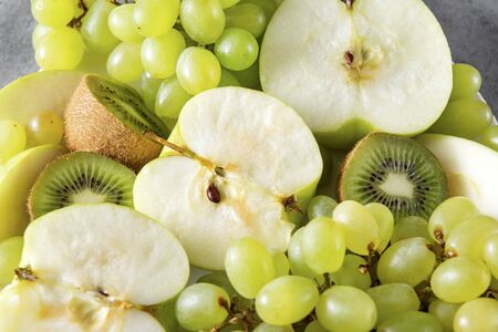 green apples, kiwi, grapes on a white wooden background, fresh fruit, top view, close up