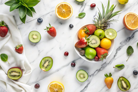 Colorful fruit arrangement on marble, healthy snack, vibrant display