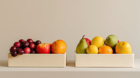 Fresh and vibrant assorted fruits arranged in wooden boxes against a neutral background highlight the beauty of natural produce, perfect for healthy lifestyle imagery.