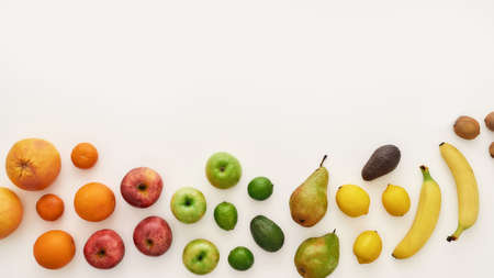 Top view of rainbow composition of various colorful fresh fruits isolated over white background
