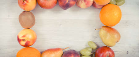Different colorful fresh fruits frame background, top view healthy food concept.