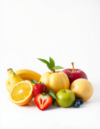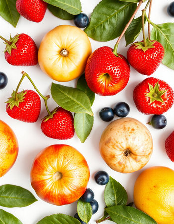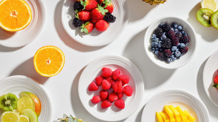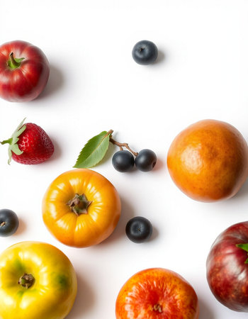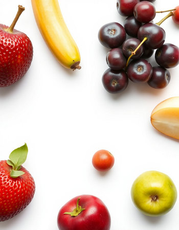 Top view of assorted fresh fruits and juicy berries captured in a minimalist style on white