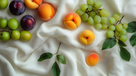 A vibrant arrangement of fresh fruits including plums, grapes, and apricots displayed on soft white fabric. Ideal for culinary themes and healthy lifestyle imagery.