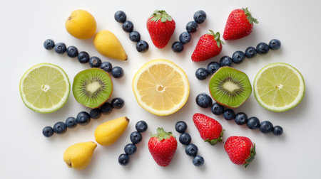 A vibrant display of assorted fresh fruits including strawberries, blueberries, lemons, and kiwis arranged artfully on a light background, perfect for health-related projects.