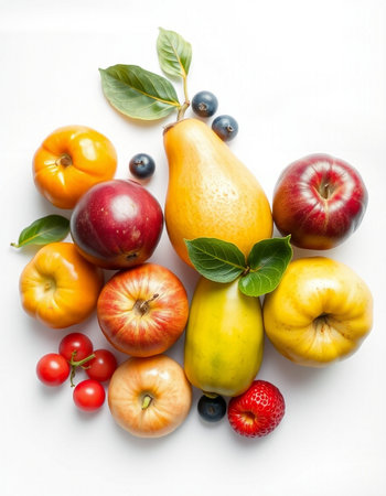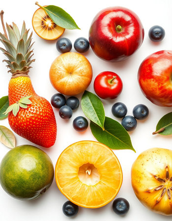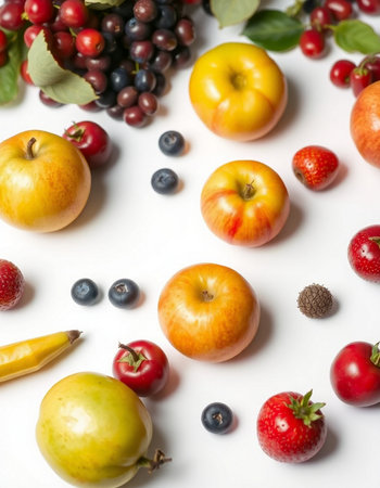 Selection of delicious fruits and berries arranged in a visually appealing pattern on white