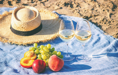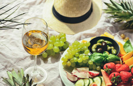 Beach summer table setting with fruits and veggies and white wine ready for seaside picnic