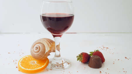 glass with red wine and strawberries on the table on a light background. Banner.