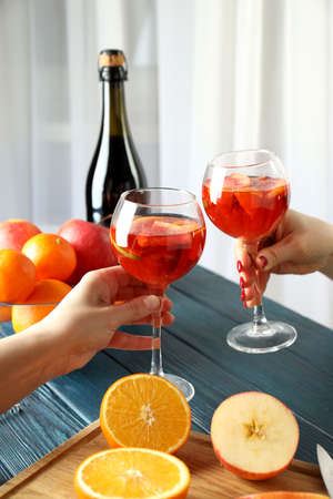 Concept of drink with Sangria on wooden table