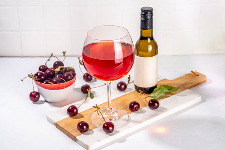 Sweet alcohol cherry wine drink, homemade cherry wine or liquor with ripe fresh red cherries on kitchen table copy space