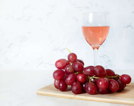 Grapes on a muted purple background with a glass of rose wine