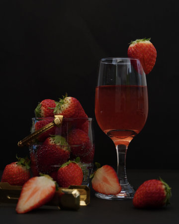 Strawberries and a glass of rose wine on a black background