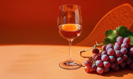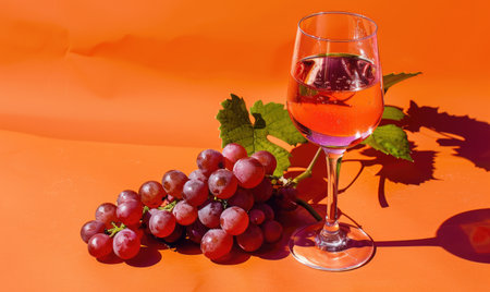 Grapes on a vibrant orange background with a glass of rose wine