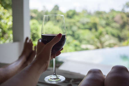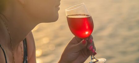 Drink wine by the sea. Selective focus.