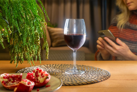 A glass of red wine, pomegranate and green fir branches on a wooden table against a blurred background of the room and a woman sitting at the table and looking