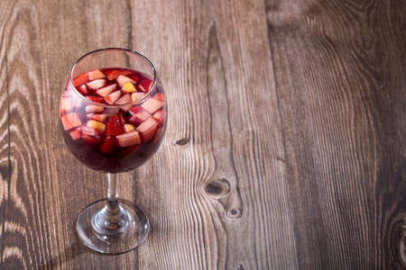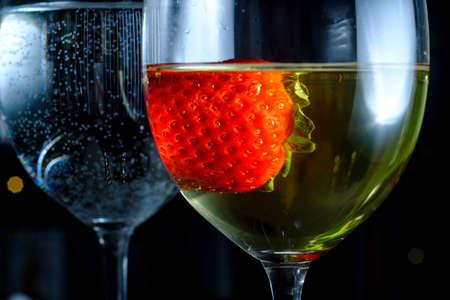 Romantic date at fancy restaurant with pinot grigio white wine with strawberry floating in glass