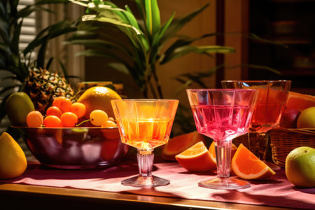 chilled cocktail glasses next to a fruit bowl, created with generative ai