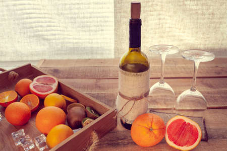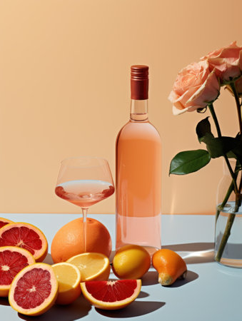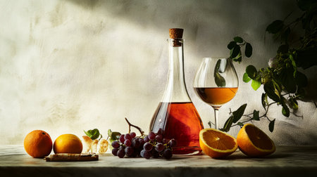 A rustic arrangement featuring a wine bottle, citrus fruits, and a wine glass, bathed in warm, natural lighting.