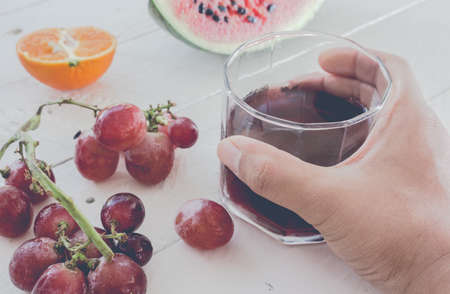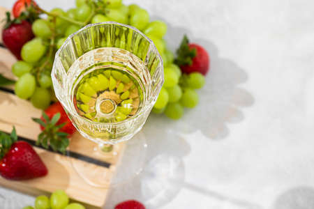 Glass of white wine, bunch grapes. Sun lught and shadow tropic background. Organic antioxidant beverage.