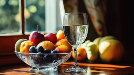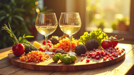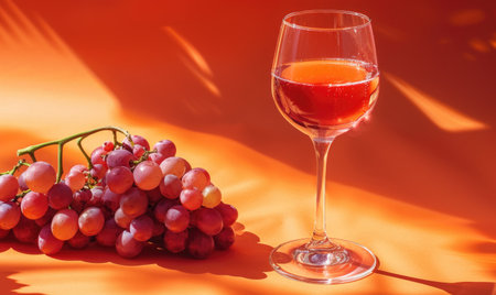 A refined still life with elegant wine glasses, grapes, and soft sunlight casting beautiful shadows, creating a sophisticated and relaxing atmosphere perfect for dining, wine, and culinary themes.