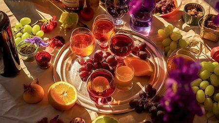 An array of colorful fruits including oranges, grapes, and strawberries is beautifully arranged on a decorative tablecloth. Glasses of drinks sit amidst the harvest, suggesting a joyful gathering.