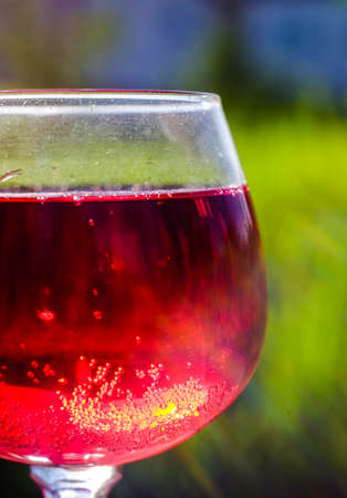 Red wine in a glass on a light concrete background in the rays of the sun. Top view, flat lay