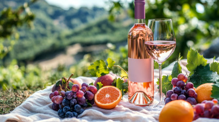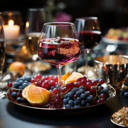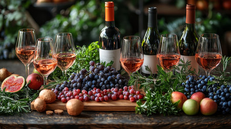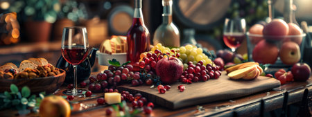 An elegant arrangement of wine bottles, glasses, and fresh fruits like grapes and apples on a rustic wooden table. The warm, inviting setting is perfect for themes related to wine, celebration, and gourmet dining.