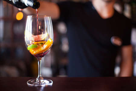 Bartender is making cocktail at bar counter at night club, Close Up. Concept about service and beverages.