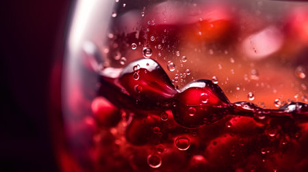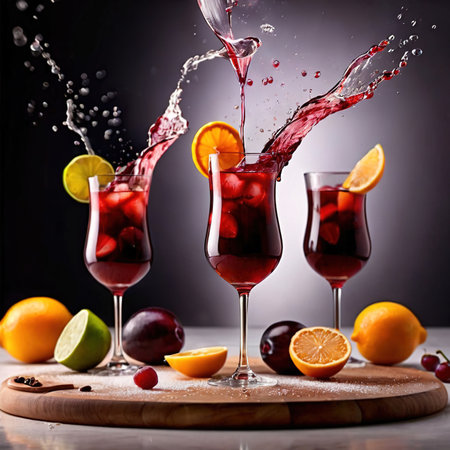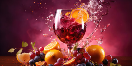 A dynamic splash of red wine surrounded by fresh fruits in a dark moody setting, emphasizing motion and richness.