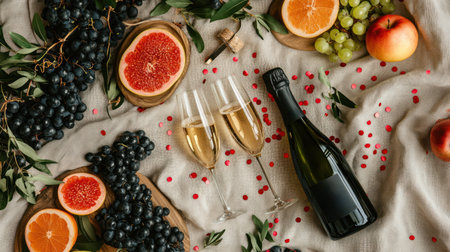 A champagne bottle with two filled flutes surrounded by grapes, citrus fruit, and red confetti on linen tablecloth for celebration