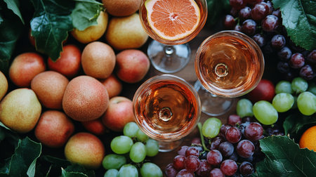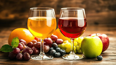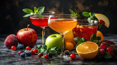 Bright apple and multivitamin juices in cocktail glasses, accompanied by a selection of fresh ripe fruits.