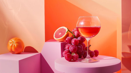 Modern still life featuring a glass of wine, grapes, and a grapefruit arranged in colorful geometric shapes, creating a vibrant and artistic composition.