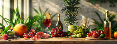 A tropical-themed setup featuring an assortment of fruits like pineapples, grapes, and strawberries, along with bottles of wine, displayed on a wooden table with lush greenery in the background, creating a refreshing and festive scene.