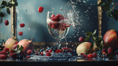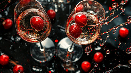 Two glasses of sparkling wine with red berries submerged inside, set against a dark background with splashes, representing celebration, luxury, and enjoyment.
