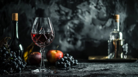 An elegant composition featuring wine bottles, glasses, and grapes styled on a textured surface with dramatic lighting.
