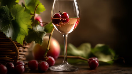 A close-up of fresh cherries and a glass of wine placed in an elegant and moody atmosphere, evoking sophistication.