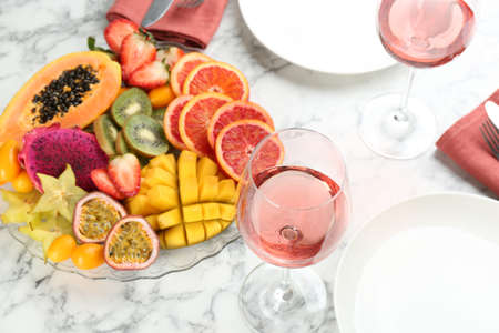 Two glasses of cold rose wine served outdoor with exotic fruits on tropical island La Palma, Canary islands, Spain with beautiful blue ocean view