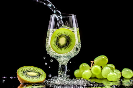 glass of kiwi cocktail with ice and mint on a black background. Generative AI.