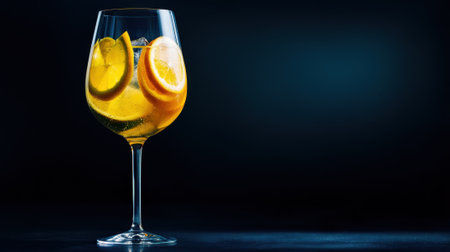 A glass of wine with a slice of fruit in it. Generative AI image.