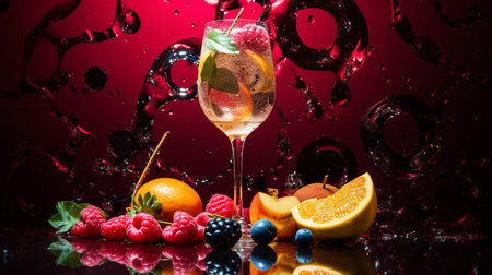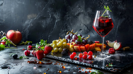 A vibrant still life composition of assorted fresh fruits, a glass of red wine, and decorative leaves, set against a lush and atmospheric background.