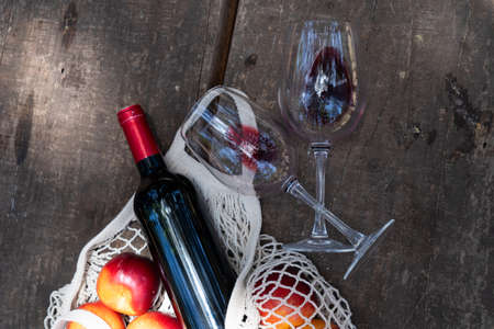 a bottle of wine with two glasses and different fruit in a tray on a wooden background