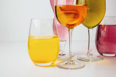 Rose wine glasses set on wine tasting. Detestation different varieties, colors and shades of pink wine concept. White background, top view
