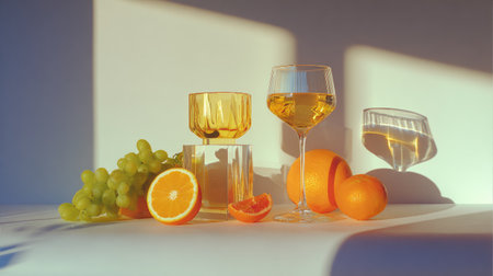 Bright arrangement of citrus fruits and grapes with elegant glassware in warm sunlight, creating a vibrant and refreshing still life for artistic beverage photography.