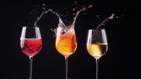 Red, and white wine leaping from glasses in a mid-air splash, isolated on black