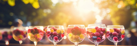 Vibrant outdoor brunch with colorful cocktails, fresh fruit platters, and dreamy bokeh backdrop